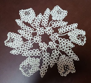 ニードルタティングレースは、チョット頭がこんがらがる様で、表目裏目で一目なので〜、結んでおかないと開くので〜、と同じフレーズを繰り返し、全部をフォールドして置かないと目がぐちゃぐちゃに〜と結構大変でした。